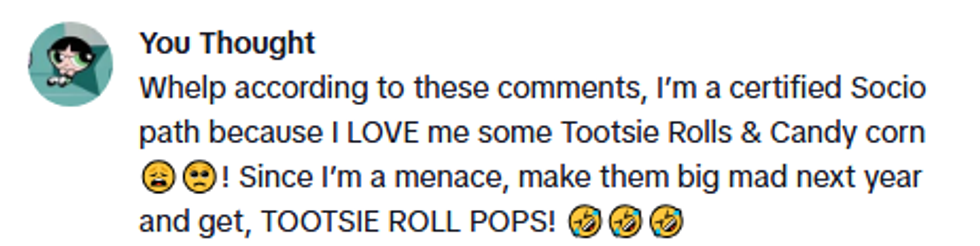 "Can I ask you a question? Why did y'all get Tootsie Rolls?"