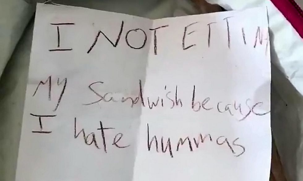 He was left laughing when he found a note addressed to "DAD" which said "I NOT Etting my sandwish because I hate hummas."
