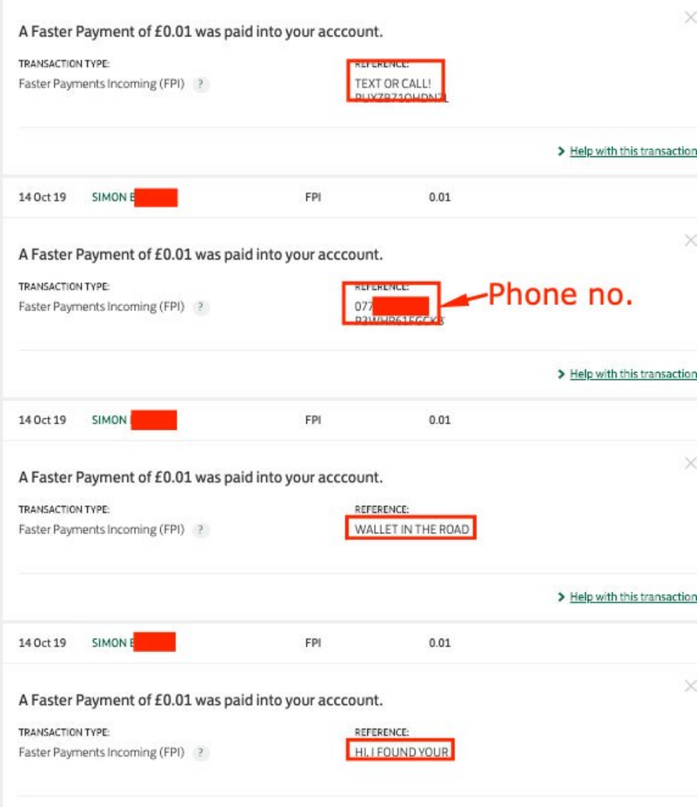 The attached screenshot reveals that the good Samaritan wrote Cameron short messages. But because the reference field had an 18-character limit, he made four deposits to get his message across.