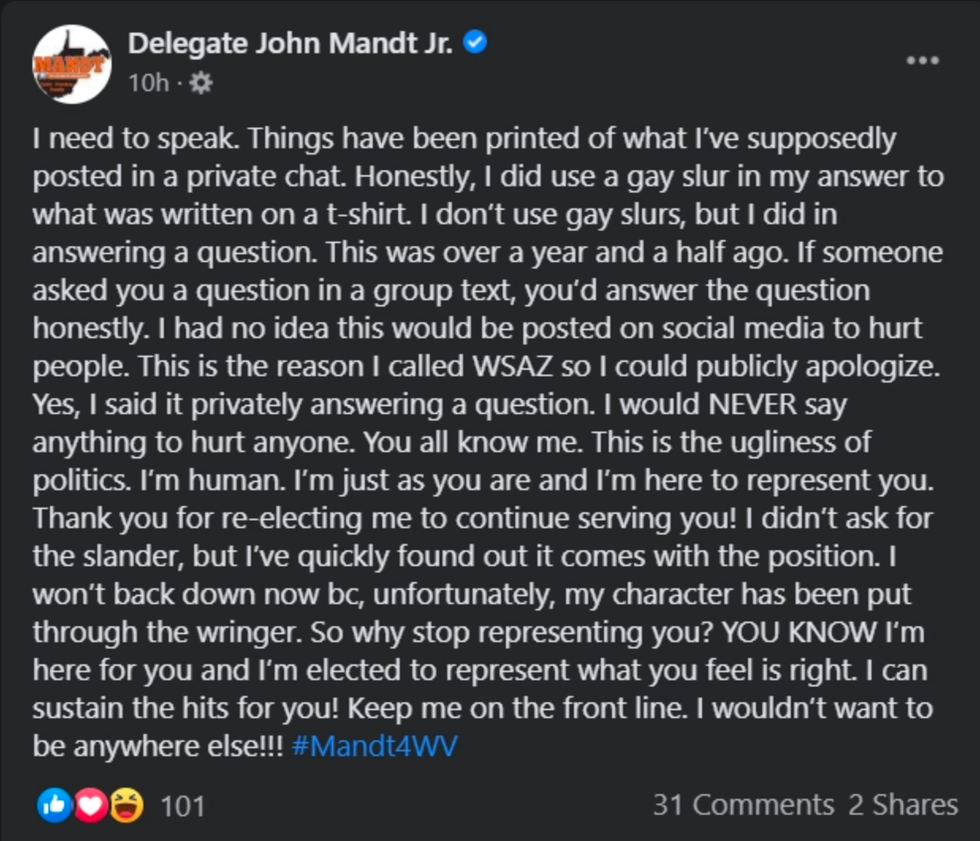 In a Facebook message made private to his followers, Mandt said he doesn't use gay slurs but admitted to using them in the group chat.