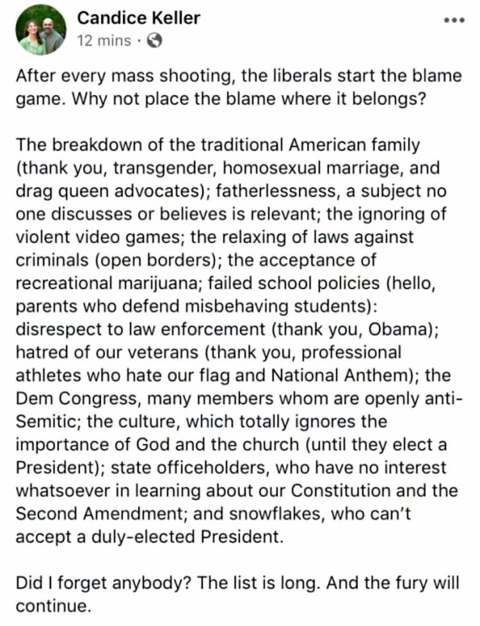 It wasn't the only time Keller would publicly display her ignorance of facts in 2019. She also posted the "real reason" for mass shootings on her public Facebook page shortly after a total of 29 people were murdered during a White nationalist hate crime in El Paso, Texas and a second mass shooting in her own home state of Ohio in the city of Dayton.
