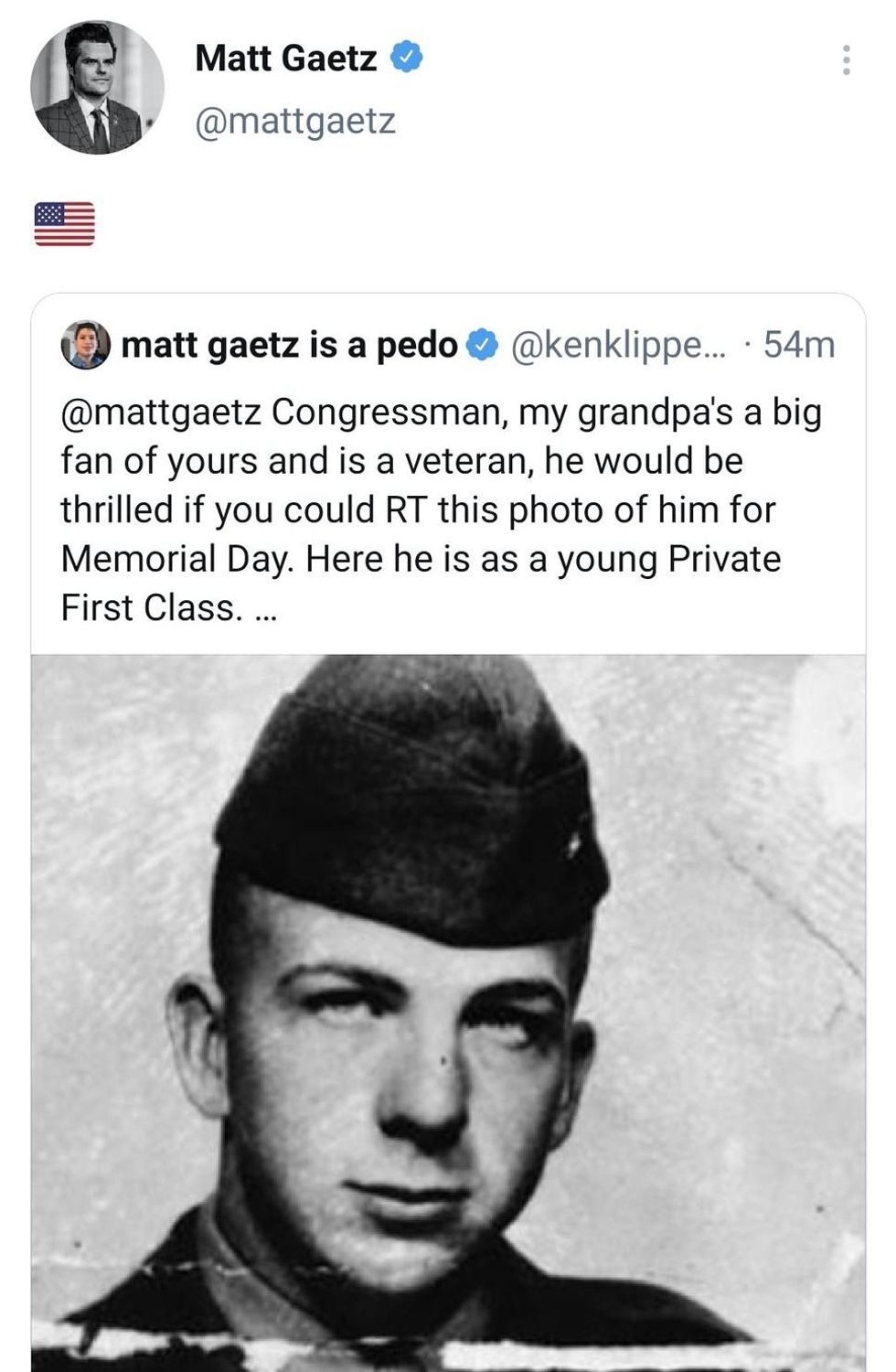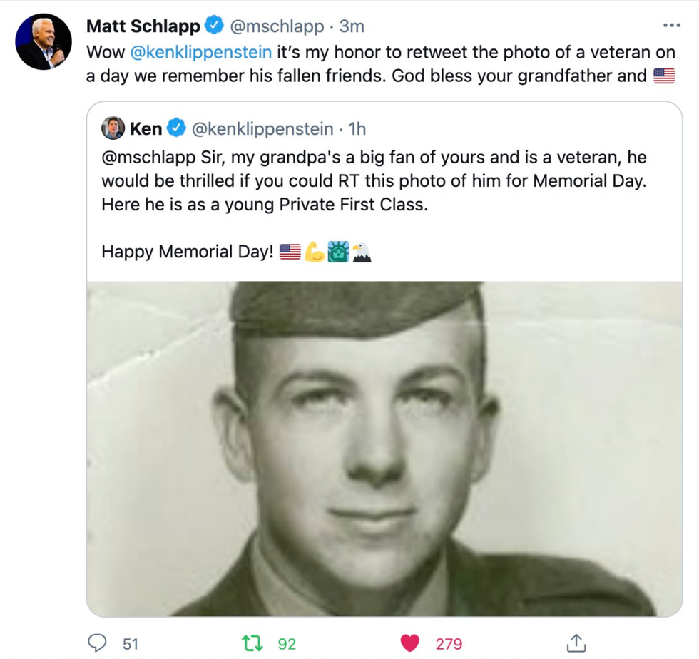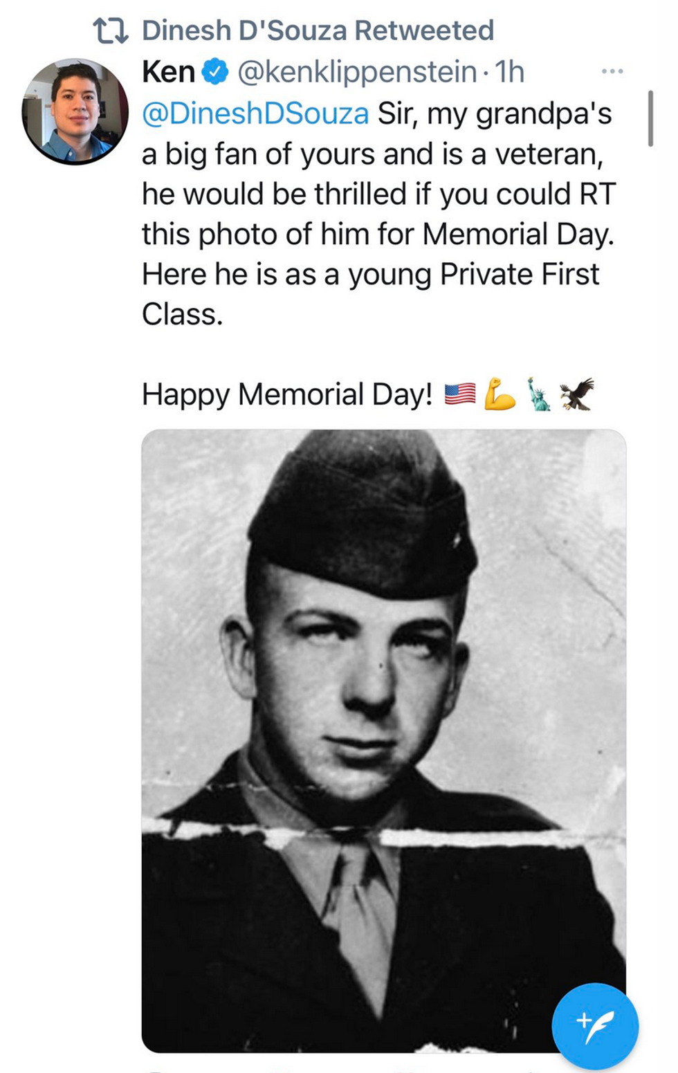 "Wow [Ken Klippenstein] it's my honor to retweet the photo of a veteran on a day we remember his fallen friends. God bless your grandfather."