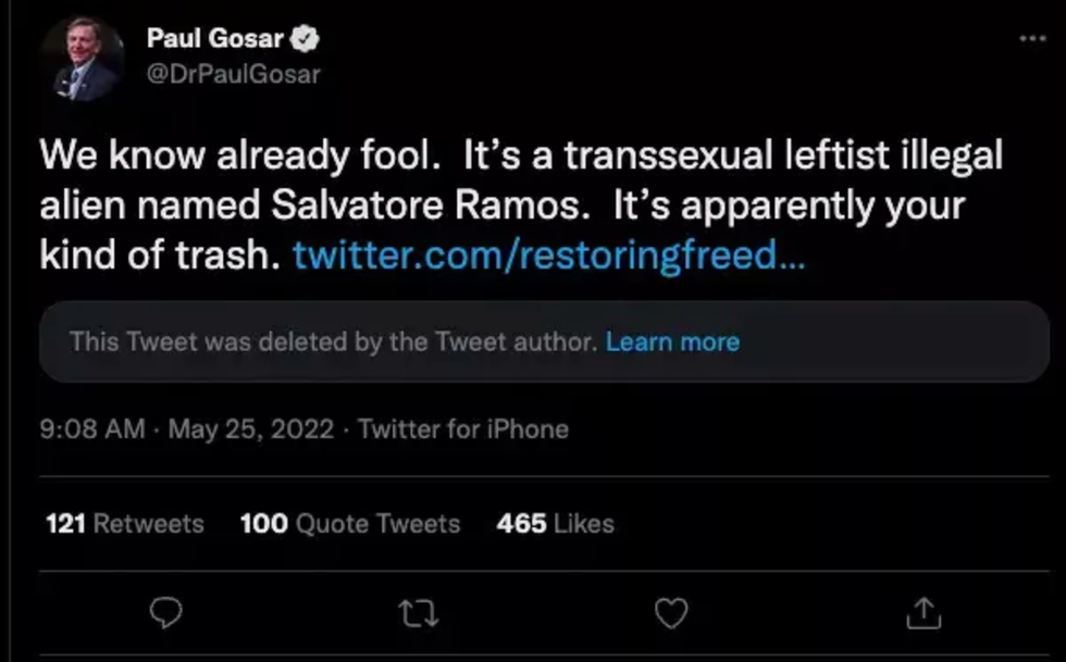 In a since-deleted tweet, Gosar misidentified the shooter as "Salvatore Ramos" and made the absurd claim Ramos was "a transsexual leftist alien."