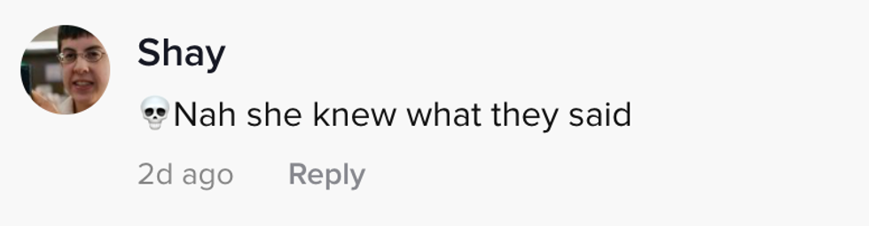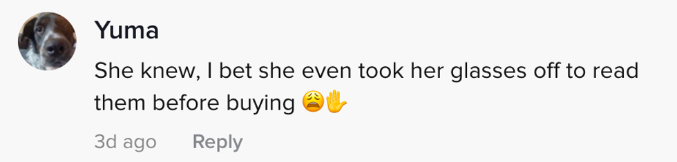 Instead, the woman, listed as TikToker @chels_bb's grandmother, was wearing pants that contained the phrase "F*ck You" printed over and over and over again in vertical white lettering to simulate pinstripes.