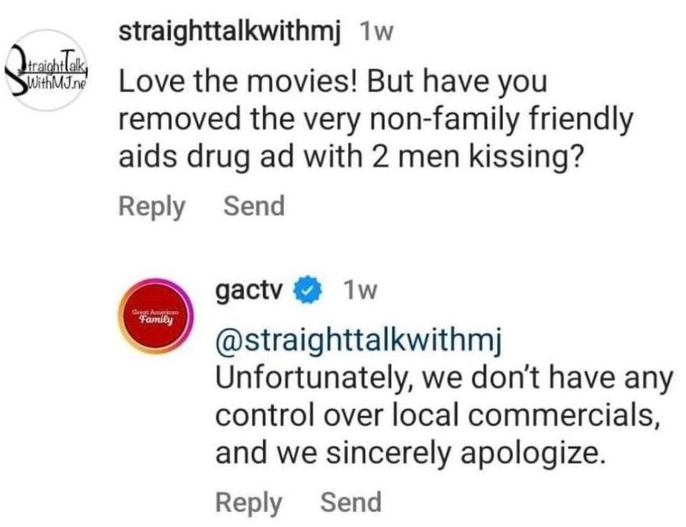 Great American Family did, however, apologize for an HIV drug ad and ads for RuPaul's Drag Race airing on their channel.