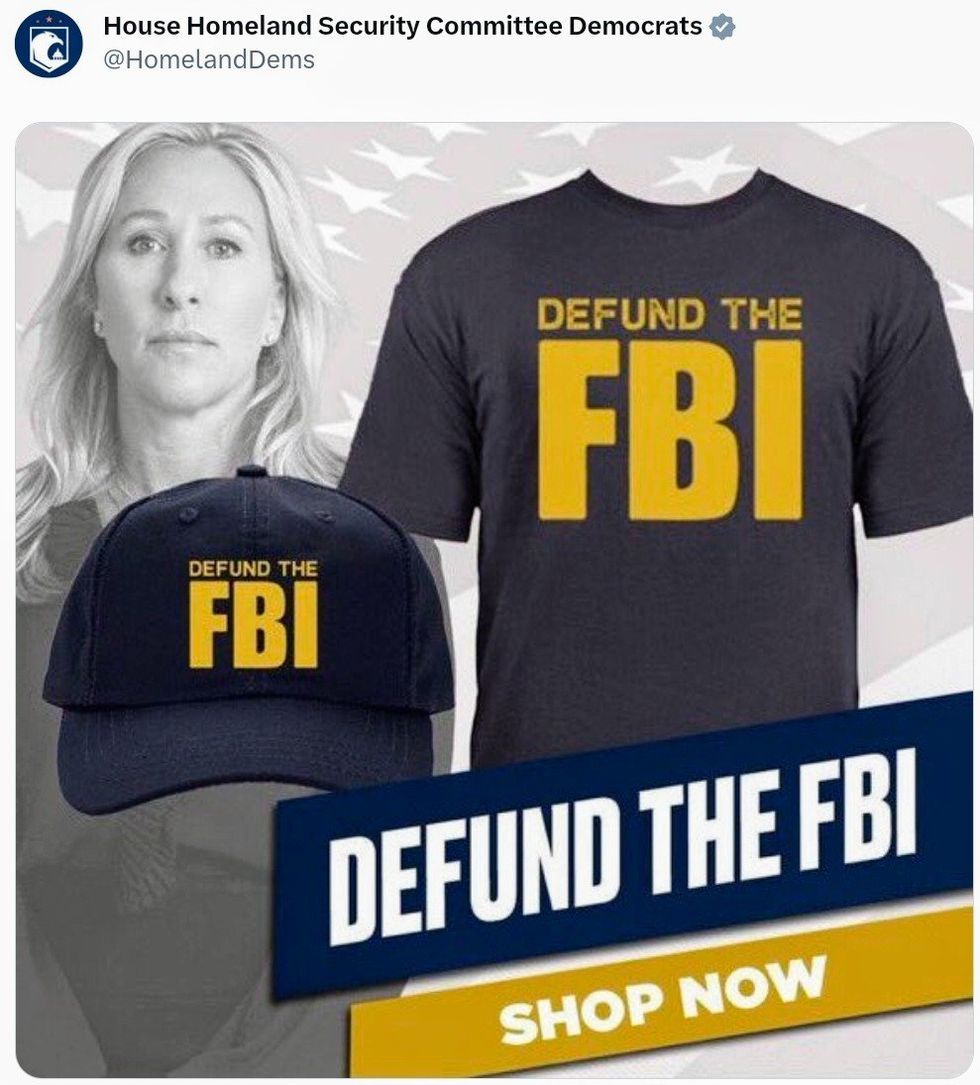 "I have to say it is pretty rich hearing the gentlewoman from Georgia express her concern about terrorism when she literally was selling 'defund the FBI' t-shirts and hats on her website for $30 apiece."