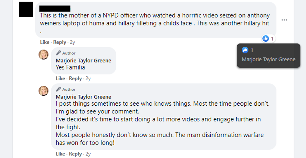 Greene, in a now-deleted Facebook post, appeared to endorse the conspiracy theory when she replied to a comment about Clinton "filleting a child's face."