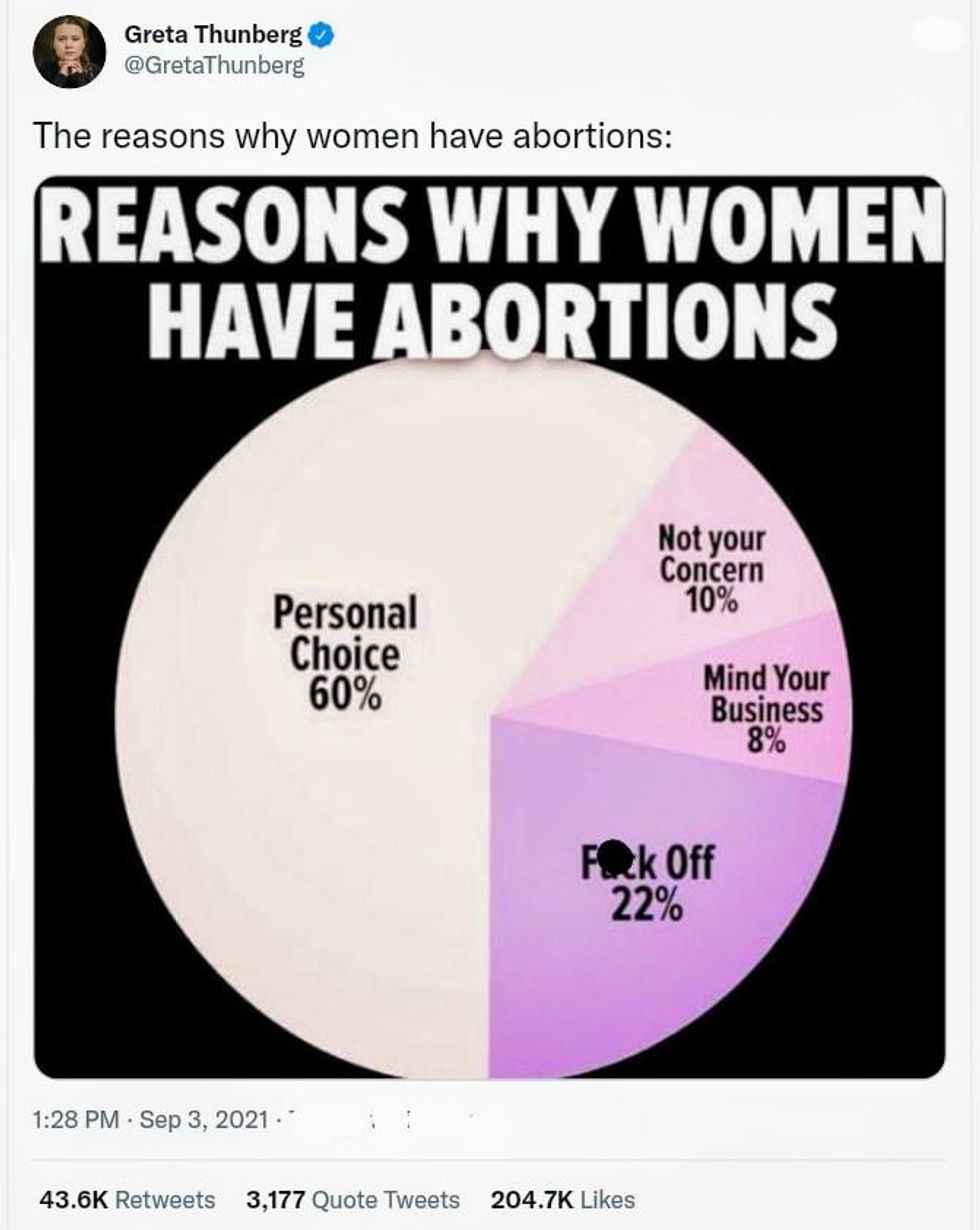Using a graphic showing the "reasons why women have abortions," Thunberg dismantled the debate with just a simple tweet.