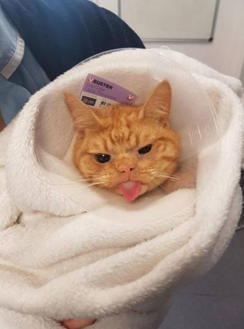 Despite his injuries, Crabby Cat seems to be taking it all in stride, you know, while being completely miserable.