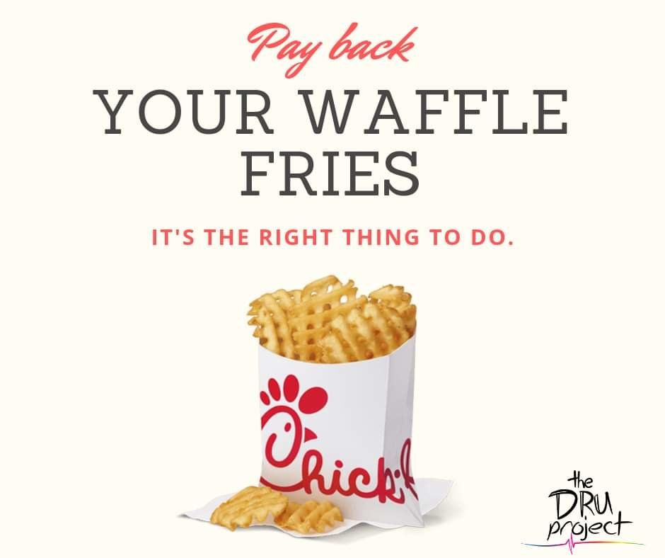 "Recently, we have gotten promises for donations by friends of The Dru Project who may have slipped and gotten waffle fries, lemonade, or a chicken sandwich from Chick-Fil-A."