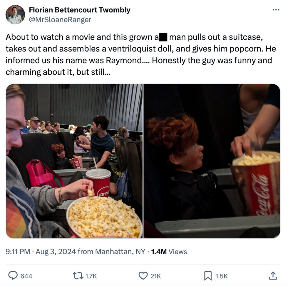 X user @MrSloaneRanger posted photos to the platform revealing that a guy who sat next to them at the theater brought in a ventriloquist dummy and sat it on the seat next to him...with its very own bucket of popcorn.
