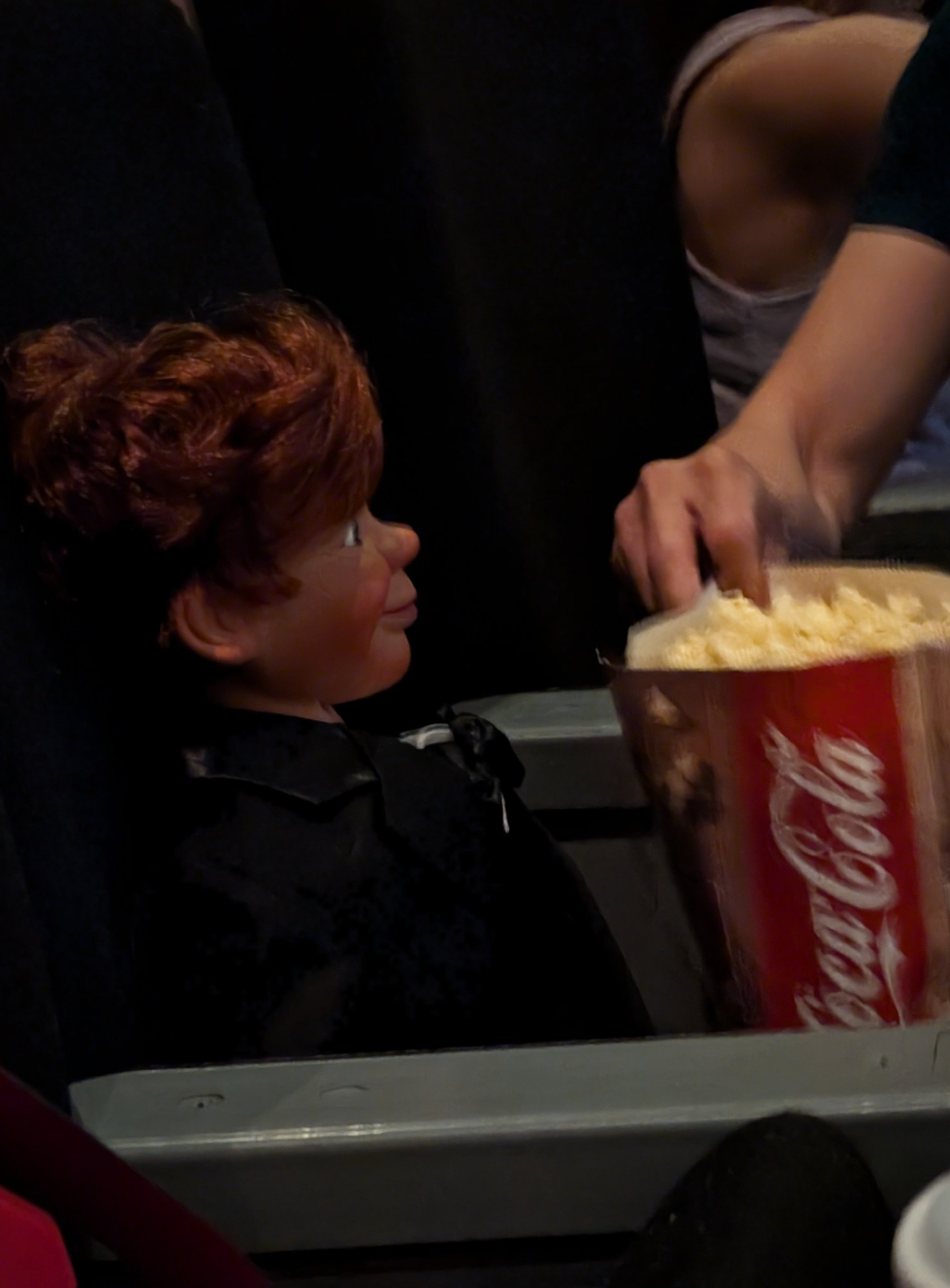 "About to watch a movie and this grown a** man pulls out a suitcase, takes out and assembles a ventriloquist doll, and gives him popcorn."