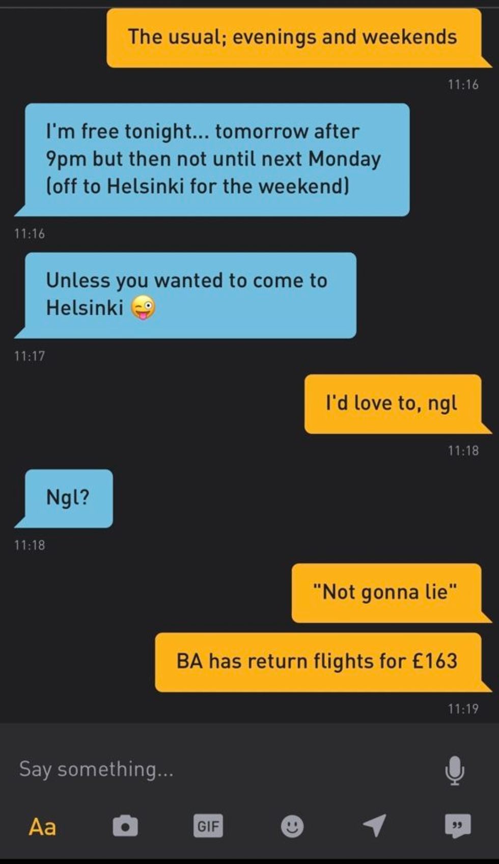 "He told me that he lives in West London and was free to meet tonight, or after he gets back from his weekend away in Helsinki and jokingly said: 'Unless you wanted to come to Helsinki?'"