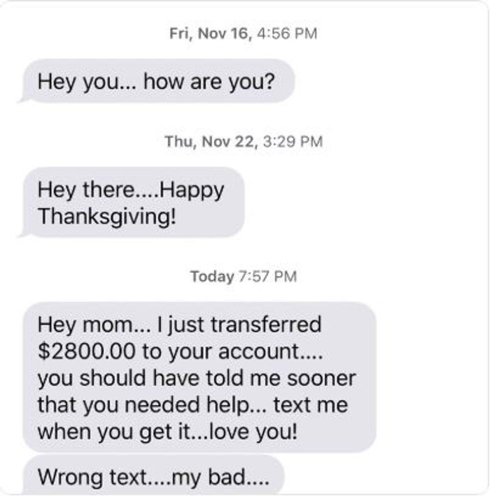 "Hey mom... I just transferred $2800.00 to your account.... you should have told me sooner that you needed help... text me when you get it...love you!"