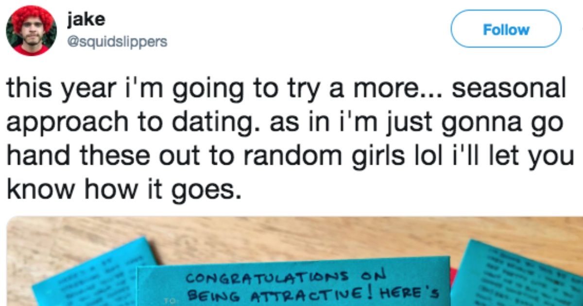 It can be hard to find a date. Sometimes you're too nervous to talk to someone. Other times, you're brave, but you get shot down, and it shakes your confidence. But maybe sometimes, a clever little gimmick would help. That's exactly the method Twitter user @squidslippers (real name Jake Moreno) used to try and find a date this year.