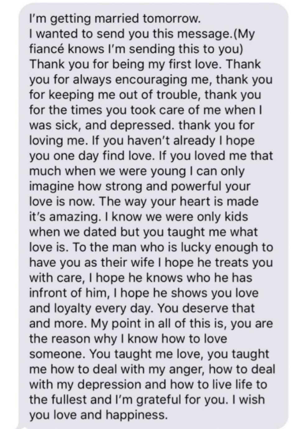 So when one woman recently received an unexpected text from an ex of hers, it left her stunned. Especially considering that he sent it to her the day before his wedding.