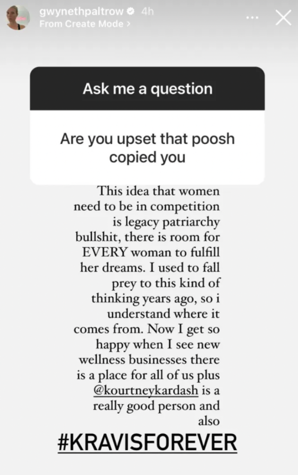 Making clear she doesn't buy into the narrative that Poosh is a Goop rip-off, Paltrow pointedly delved into our culture's tendency to want to pit women against each other at every chance we get. She wrote in response: