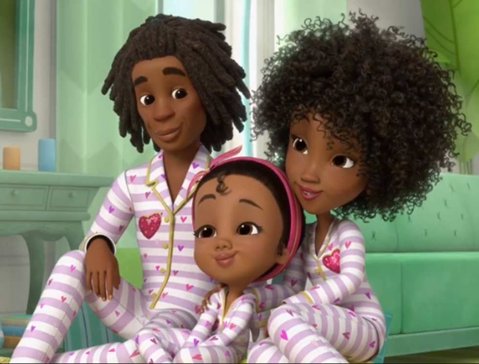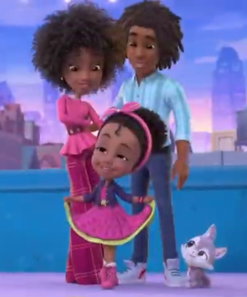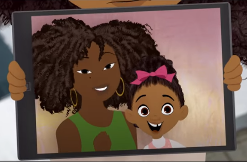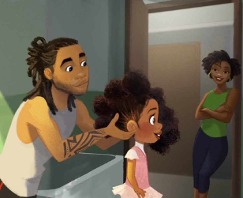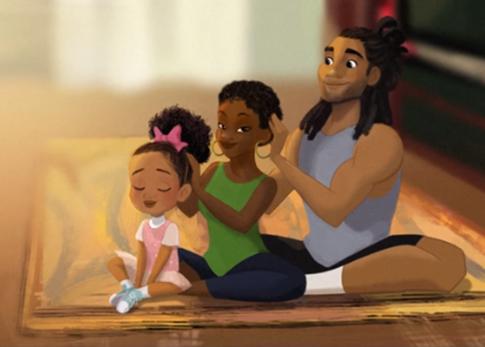 The project revolved around a Black family—a father with locs, just like Hair Love; a creative and determined young girl and her feline sidekick, just like Hair Love. It also features a mom whose hair looks almost exactly like the mother from Hair Love in the end scenes.