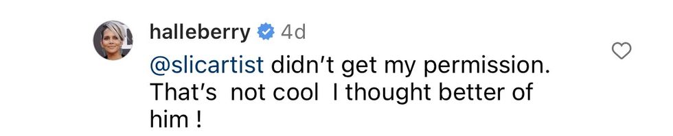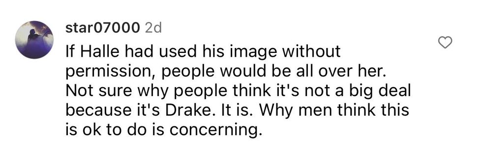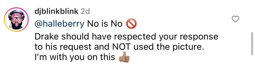 Another person commented that Berry shouldn't be upset because the photo is owned by Getty Images, but the actor claimed she explicitly told Drake "no" when he approached her about it.