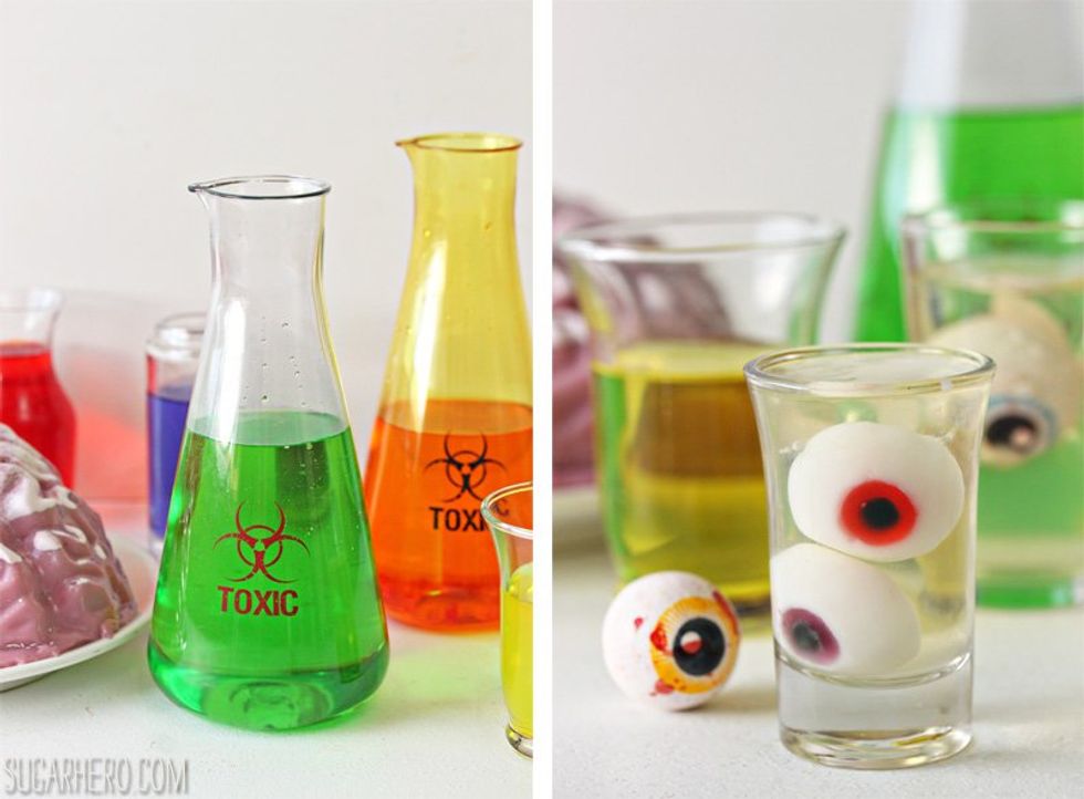 Yes, these are all scary jello shots, some made with molds. They take more time to create and prepare, but are a creepy touch floating in a glass and served on a tray. These are good treats to make ahead of time. Be careful to label which ones contain alcohol, as many can be made without the vodka. Floating Eyeballs: Zombie fans will slurp these up. They can take a little prep time but make a great ice breaker as a first drink for arriving guests. Serve these non-alcoholic floaters in blood orange soda to amp up the creep factor.