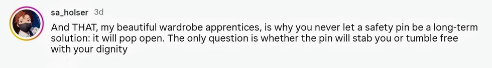 "Luckily, our dresser, Mary, had a safety pin and she pinned them in the back, and so I thought I was good to go. They introduced me, and as I started walking to the podium, I feel the pin pop!"