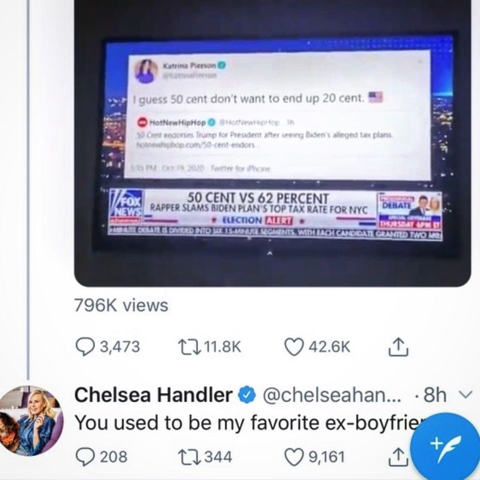 After rapper 50 Cent publicly expressed his uncertainty about voting for Joe Biden, citing the Democratic Presidential nominee's plan to raise taxes on millionaires and billionaires, his ex-girlfriend Chelsea Handler threw him some shade on Twitter.