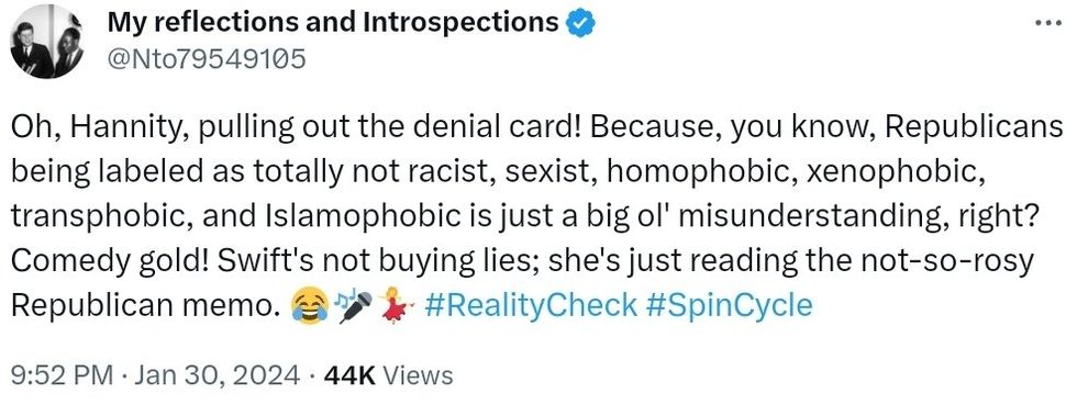 If Swift believes all that, she's probably paid attention to the words and deeds of the GOP and conservatives, but calling the truth fake news is also part of the conservative playbook.