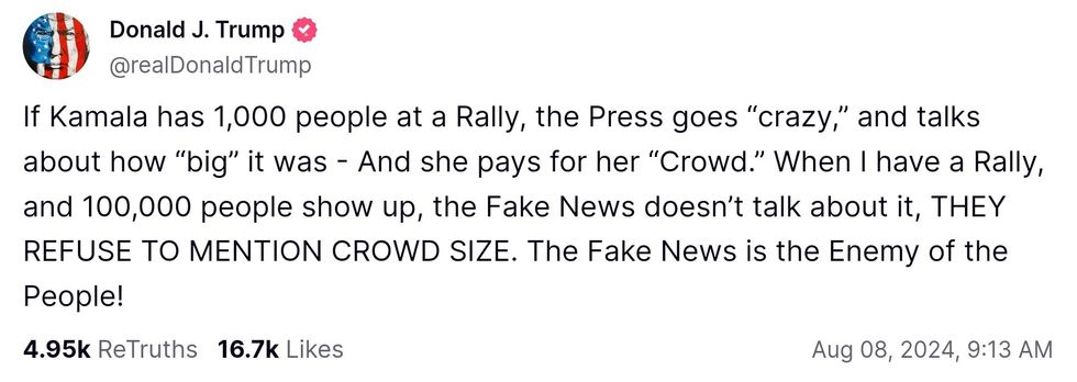 "If Kamala has 1,000 people at a Rally, the Press goes 'crazy', and talks about how 'big' it was - And she pays for her 'Crowd'. When I have a Rally, and 100,000 people show up, the Fake News doesn’t talk about it, THEY REFUSE TO MENTION CROWD SIZE. The Fake News is the Enemy of the People!"