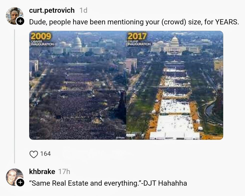 He's so triggered by his failure to draw the crowds of his predecessors and rivals that the phrase "alternative facts" was coined by a member of his administration to explain the many lies about the small crowds that attended his inauguration in comparison to those who showed up for Democratic President Barack Obama.