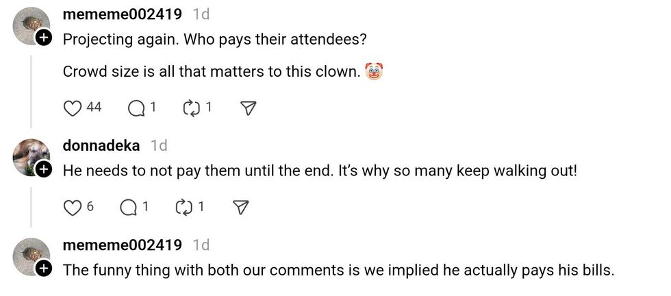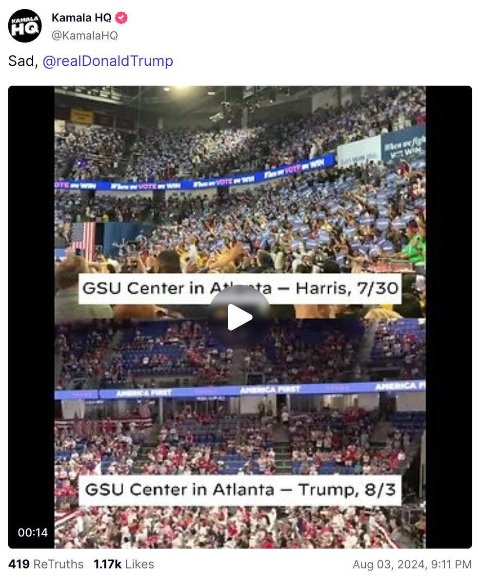 Now the Harris 2024 campaign account "Kamala HQ" is poking that sore spot after Trump posted a claim the media ignores his "100,000" person rallies.