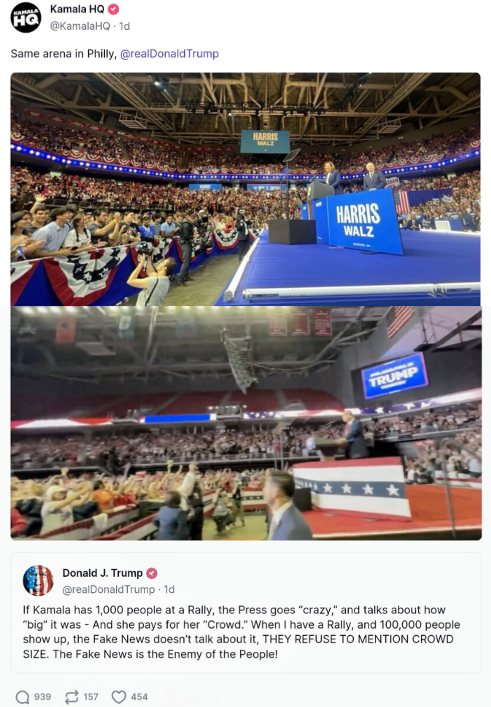 Choosing their own response, Kamala HQ posted photos of rallies held in the same arena—by Trump in late June and then by Harris this week—in Philadelphia, Pennsylvania. The post included Trump's own boastful post.