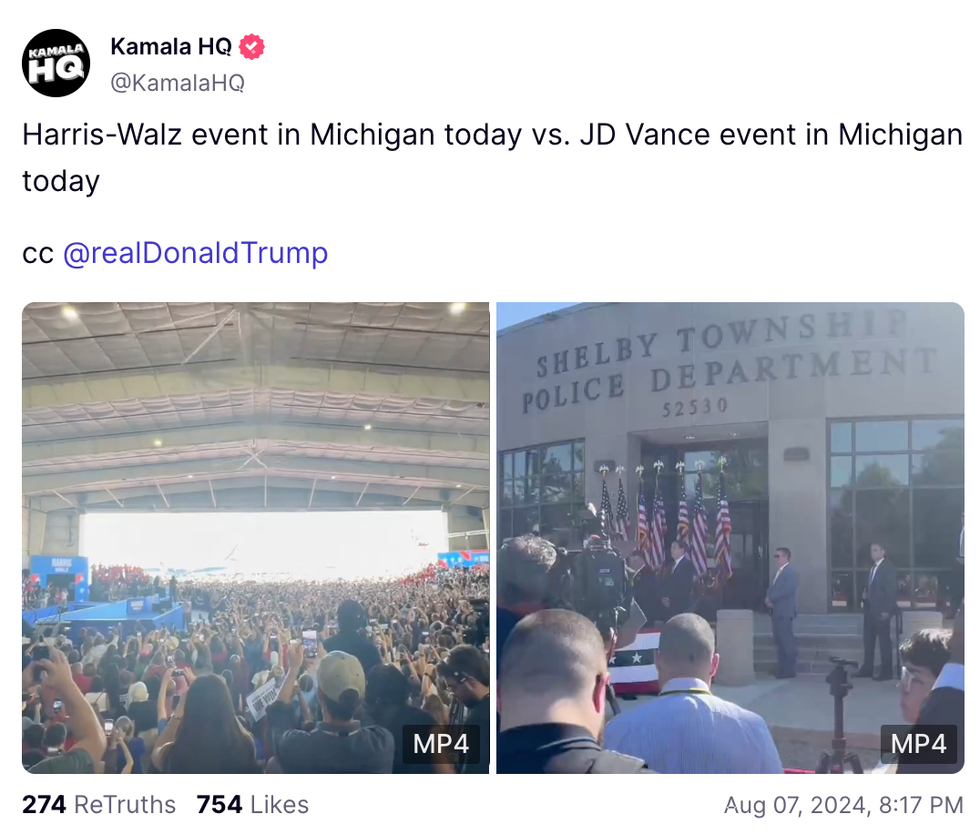The Kamala HQ account also tagged Trump in their Truth Social caption: