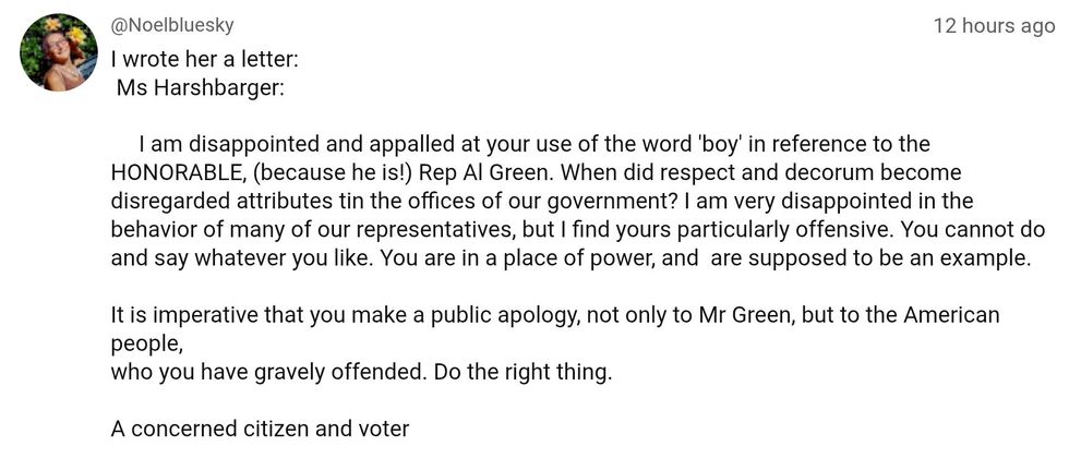"Representative Green is a distinguished member of Congress who has spent his career fighting for working people, especially our veterans. If Congresswoman Harshbarger truly wants to bring people into the love of Christ, as she said on the podcast, she should apologize for her comments and emulate Al Green’s example of selfless service to his constituents and our country."