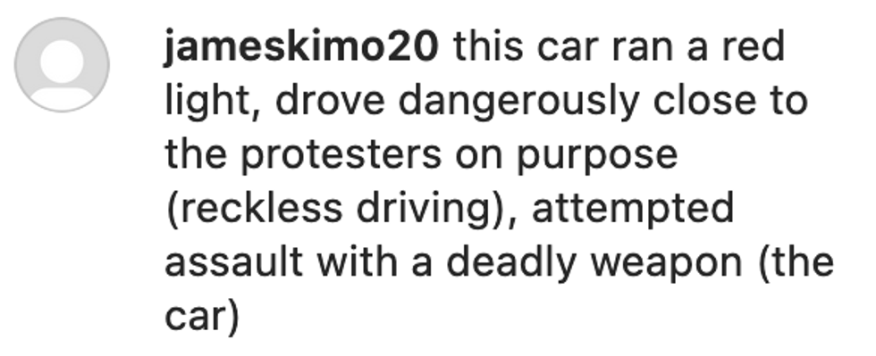 As the group of demonstrators crossed the street in the crosswalk, the black Honda made an abrupt and illegal U-turn, appearing to aim his vehicle towards a Black protestor, one of those who had exchanged words with the driver moments before.