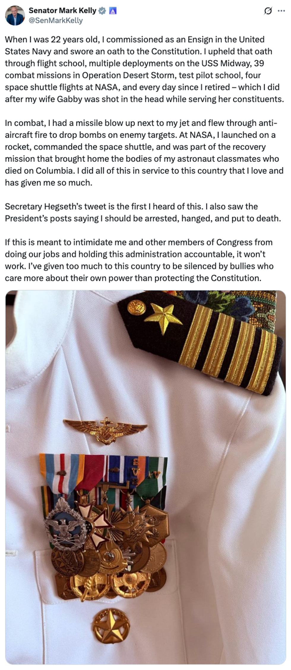 "However, Mark Kelly (retired Navy Commander) is still subject to UCMJ—and he knows that. As was announced, the Department is reviewing his statements and actions, which were addressed directly to all troops while explicitly using his rank and service affiliation—lending the appearance of authority to his words."