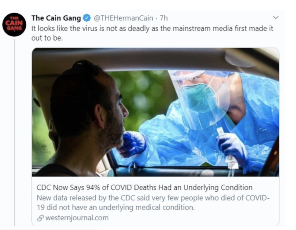 Herman Cain's Twitter account—now run by his family—once again dismissed the threat, with the added irony that Cain himself died of the virus.