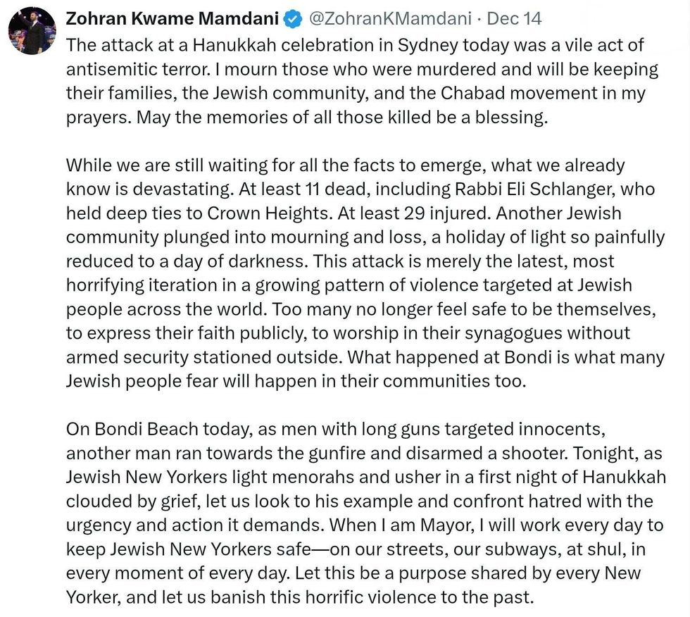 "On Bondi Beach today, as men with long guns targeted innocents, another man ran towards the gunfire and disarmed a shooter. Tonight, as Jewish New Yorkers light menorahs and usher in a first night of Hanukkah clouded by grief, let us look to his example and confront hatred with the urgency and action it demands."