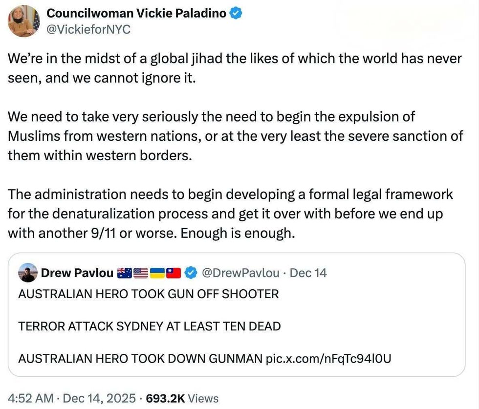 Like New York City Councilwoman Vickie Paladino, who exploited the shooting to get herself on Fox News after calling on the Trump administration to denaturalize Muslim citizens and expel them. Paladino further claimed all "Western nations" need to expel all of the Muslims in their countries.