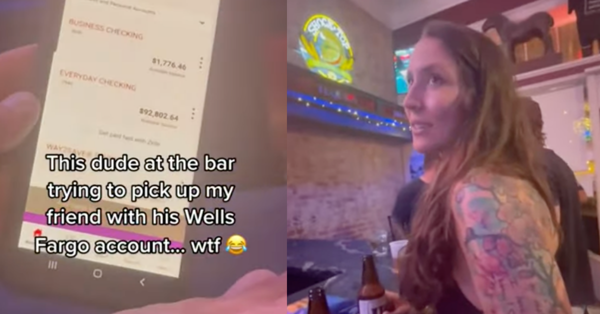 The video shows the man approaching a woman at a bar, showing her a sizable bank account balance. It really does not go well for him.