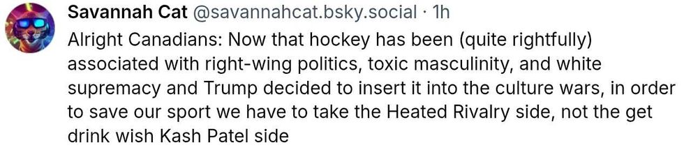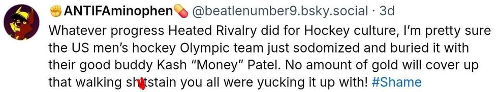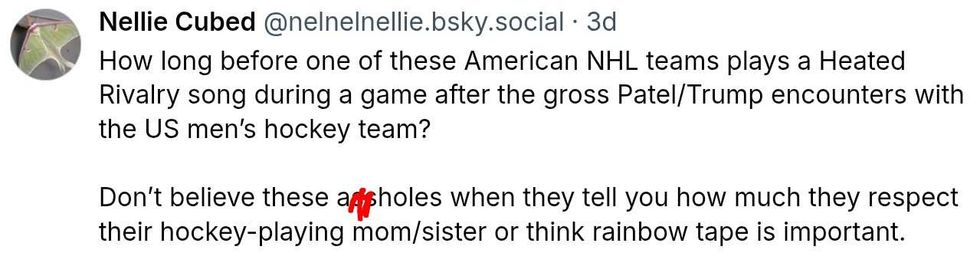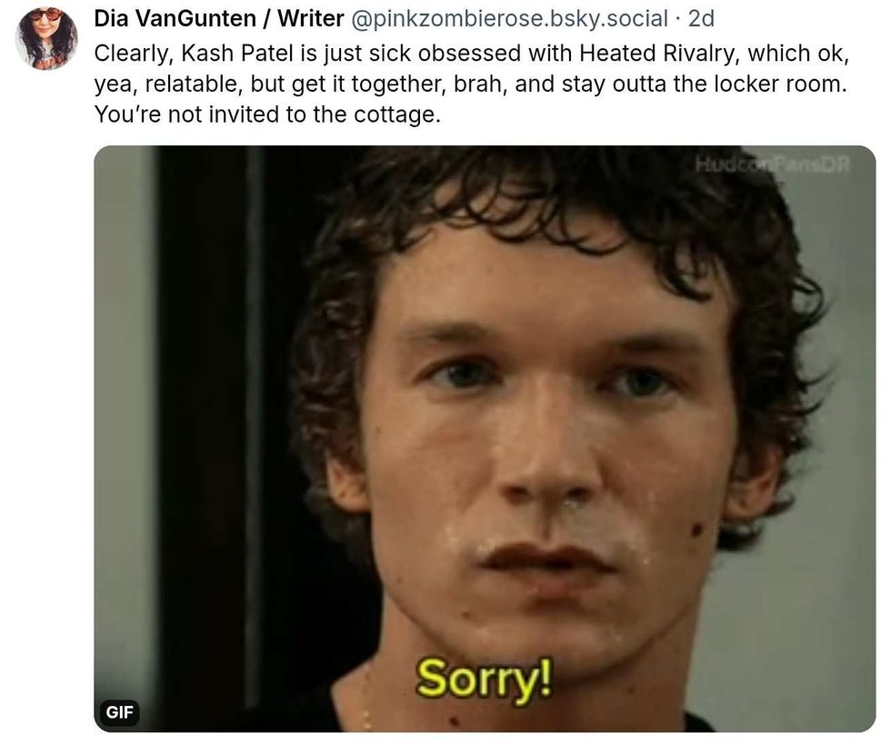 The whole point of Heated Rivalry is that these men love a sport that doesn't love them. Then y'all are like "I can't believe they let Kash Patel hang out in the locker room!" I can't believe that you got all the way to the cottage and didn't understand why they had to hide there in the first place.