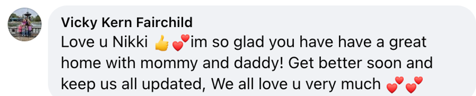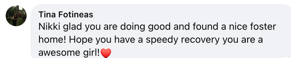 "Hi it’s me Nikki! Just checking in to let you know I’m with the bestest foster couple ever. Ones name is Daddy and the other ones name is Mommy."