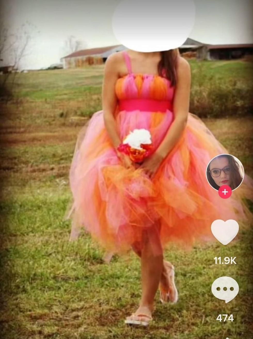 The pictured matrimonial gown was an orange and pink tutu with tulle for days, and if VanMeter intended for it to appear as though it was dyed using rainbow sherbet that was left out in the sun too long, she nailed it.