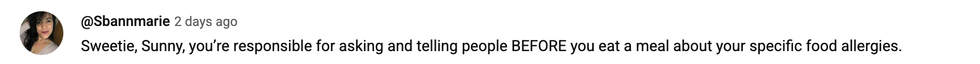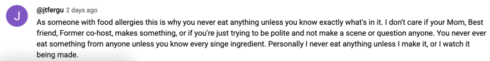“She has this wonderful food, Greek food. And I have a terrible allergy to walnuts. As I'm eating the food, Alyssa asks, 'Are those walnuts in here?' And she says 'yes.' So I panic immediately.”