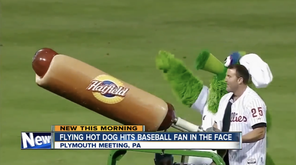 The mere sight of the mascot blasting the stands with weiners was as ridiculous as it sounds, but unfortunately, McVay wasn't laughing after getting hit. She was left with a serious shiner that required icing every 20 minutes afterward.