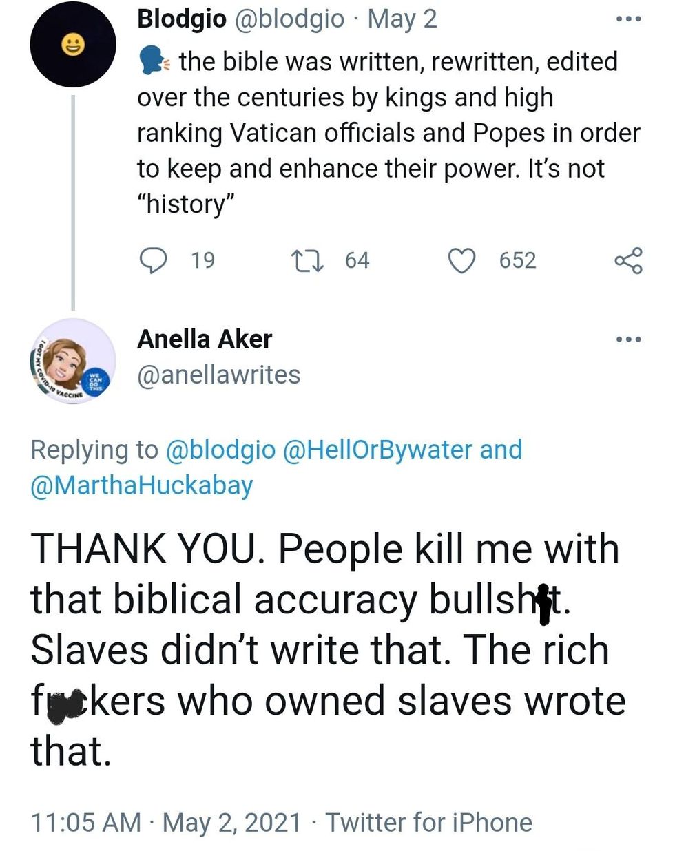 "The question he should have pushed back her way was was their marriages in slavery? Were families and precious babies born (and I am talking about LIFE itself) into or out of slavery? Were slave owners ever known to be 'GOOD' to their slaves?"