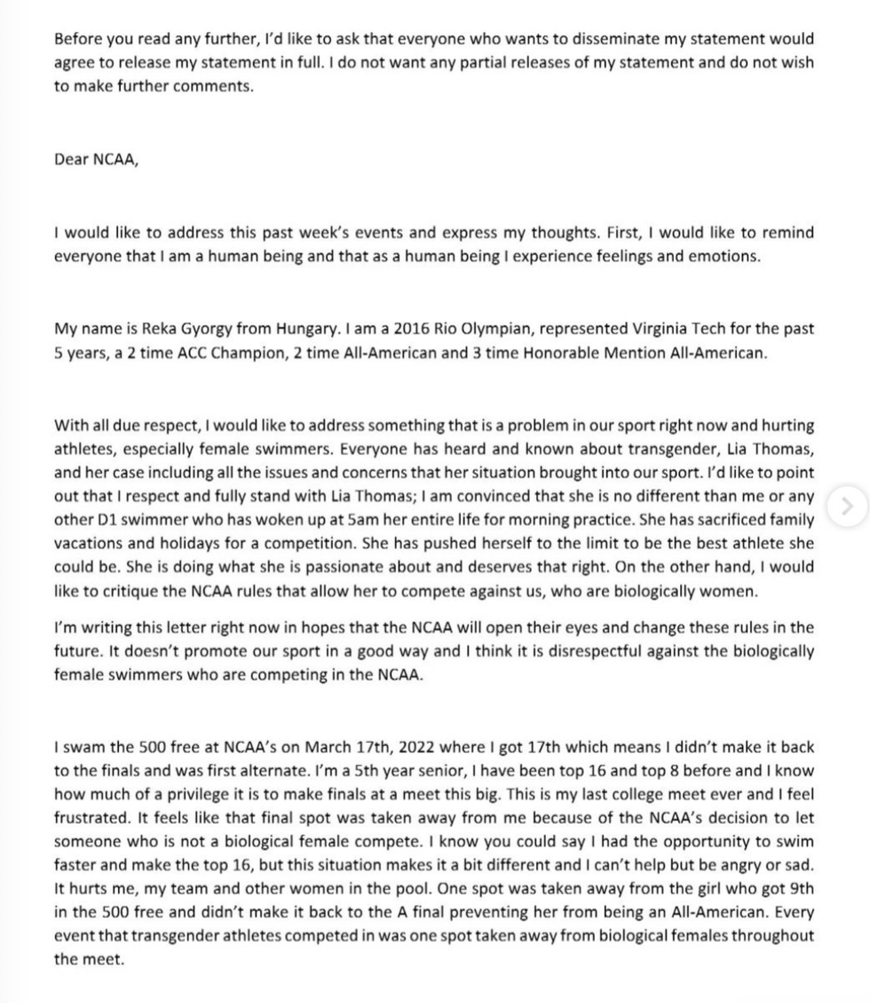 Mary Margaret Olohan of the Daily Wire obtained Gyorgy's letter to the NCAA complaining about Thomas' inclusion in the race.