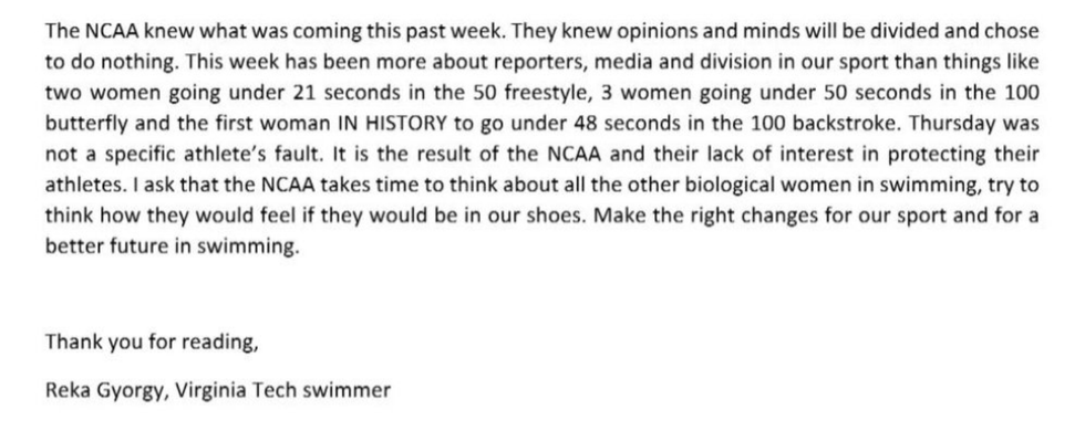 “I ask that the @NCAA takes time to think about all the other biological women in swimming, try to think how they would feel if they would be in our shoes. Make the right changes for our sport and for a better future in swimming."