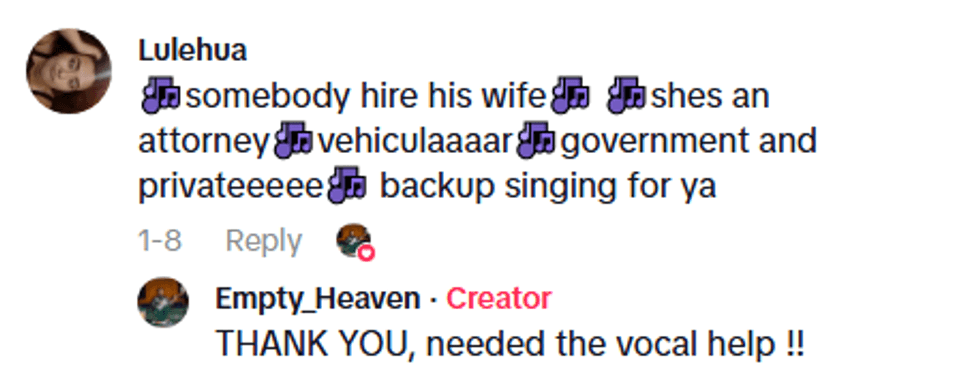 To help out his wife, who is looking for a new job as an attorney, TikToker @empty_heaven took that idea and ran with it by writing a song for her, featuring her goals and qualifications.