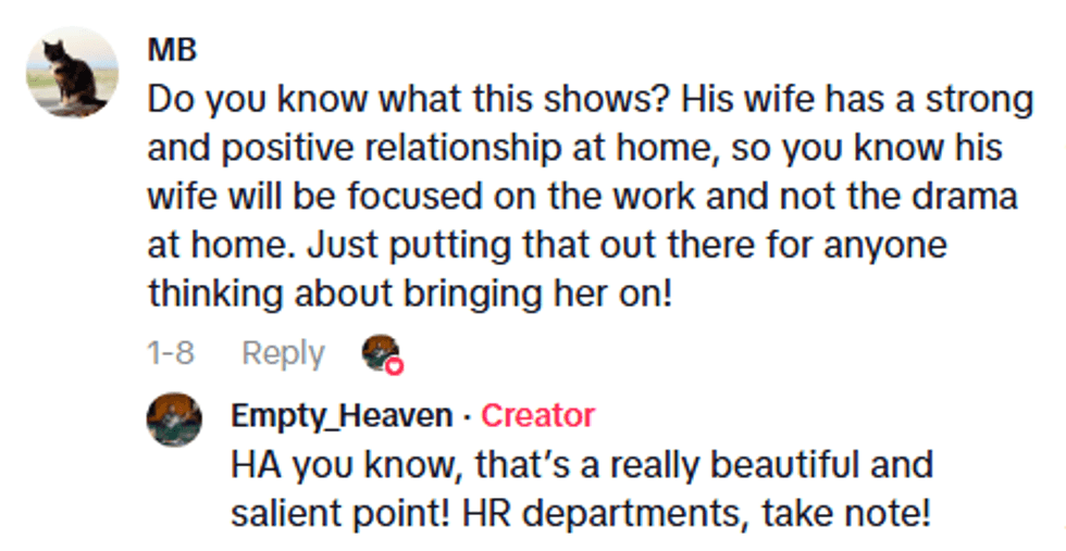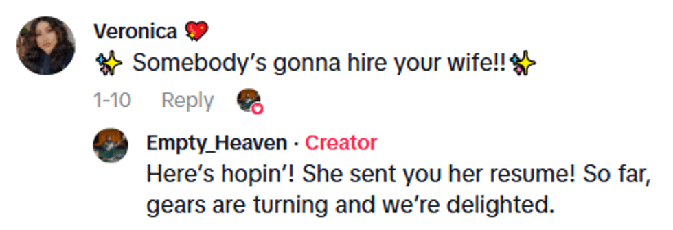 Though it was much too soon for her to actually have an offer in place, TikToker @empty_heaven had received many messages that featured support, contact information, and job listings for him to pass on to his wife.