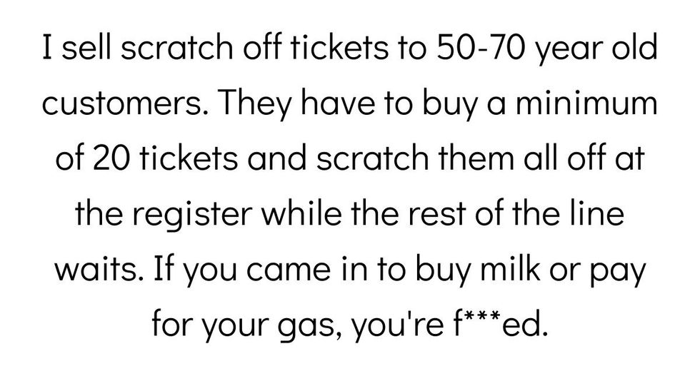 I sell scratch off tickets to 50-70 year old customers. They have to buy a minimum of 20 tickets and scratch them all off at the register while the rest of the line waits. If you came in to buy milk or pay for your gas, you're f***ed.